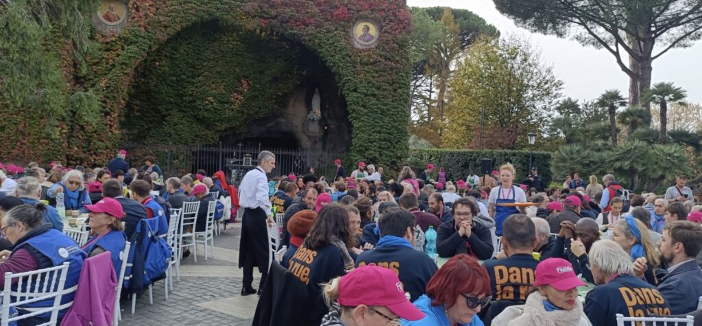 « Nous ne pouvions pas tous entrer dans la salle Paul VI, c’est pourquoi notre groupe Fratello a eu l’autorisation d’organiser un banquet dans les jardins du Vatican, près de la grotte qui rappelle la rencontre de la Vierge avec Bernadette, pauvre parmi les pauvres », explique Fatima Lucarini, une des volontaires, membre de l’équipe d’organisation de cet évènement extraordinaire.